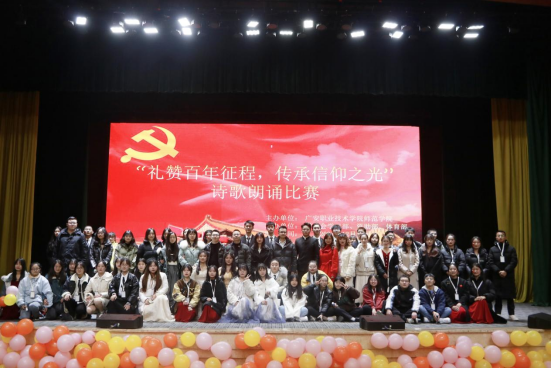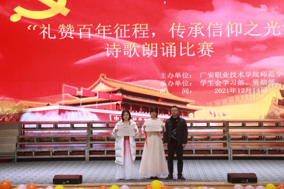 为庆祝建党100周年,弘扬传承爱国精神,增强同学们民族自豪感和文化自信心,提高员工语言表达能力和朗诵水平,beat365官网登录中文于12月14日晚在杏坛举办了以“礼赞百年征程,传承信仰之光”为主题的诗歌朗诵比赛。党总支书记龙治勇、党总支副书记李勇、员工管理科科长李智强,21级、18级小教全体员工及辅导员参加了本次比赛。