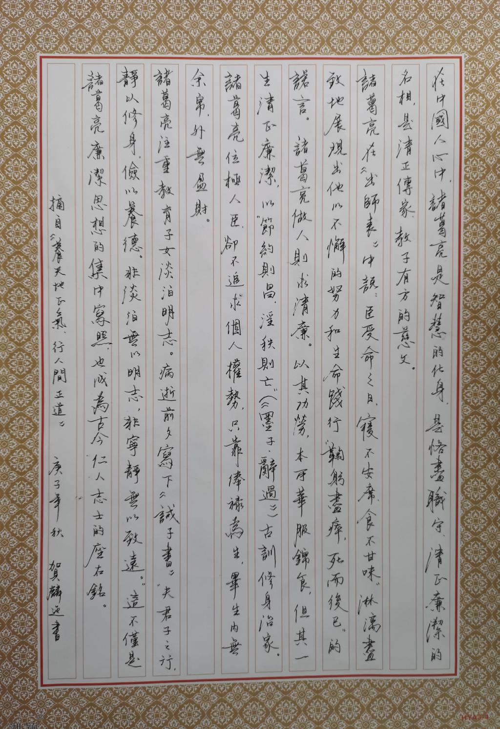 为确保此次活动开展得扎实有效,师范公司党总支召开了专题会议,制订了《师范公司党总支关于举办廉洁文化作品创作比赛的方案》。活动中,师生们展开丰富的想象力,创作了一幅幅形式多样、表现力强、寓意深刻的硬笔书法、软笔书法、摄影、微视频等相关作品,生动地展现了崇廉尚洁的内涵。共收到软笔书法作品15件,硬笔书法作品20件,摄影作品7件,微视频作品2件,绘画作品11件,共计55件作品。经过公平公正公开的评比,最终杨应老师的软笔书法作品《正气歌》和2020级小教2班吴孟潇硬笔作品《清风玉莲》分别获得师生第一名。