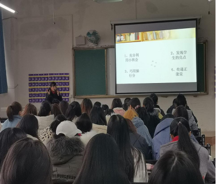 公开课中,杜雨娟老师从自身教学经验谈起,循序进入主题“知行合一,止于至善 ”。进而提出做一名轻松、幸福的班主任应该学会“管”。并分述“管”之三部曲:敢管、善管和共管。从立规矩、抓典型、树威信、充分利用小班会、发现员工亮点、巧用操行分、传递正能量等方面一一举证,条理清晰、例证丰富地详述了“管”的要点、乐趣和意义。最后杜老师总结到,做一名优秀合格的班主任始终离不开教师团队、家校联系和班干部培养。鼓励同学们从细节入手、从现在做起,培养沟通交流的能力、教学技能和爱生育生的智慧。