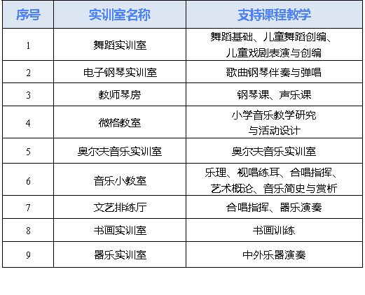 已建成与专业紧密联系的稳定的校外实训基地20个,校内各类专业实训室80个,其中钢琴实训室71个,专项实训室9个,校内校外实训基地功能互补,以满足人才培养要求。